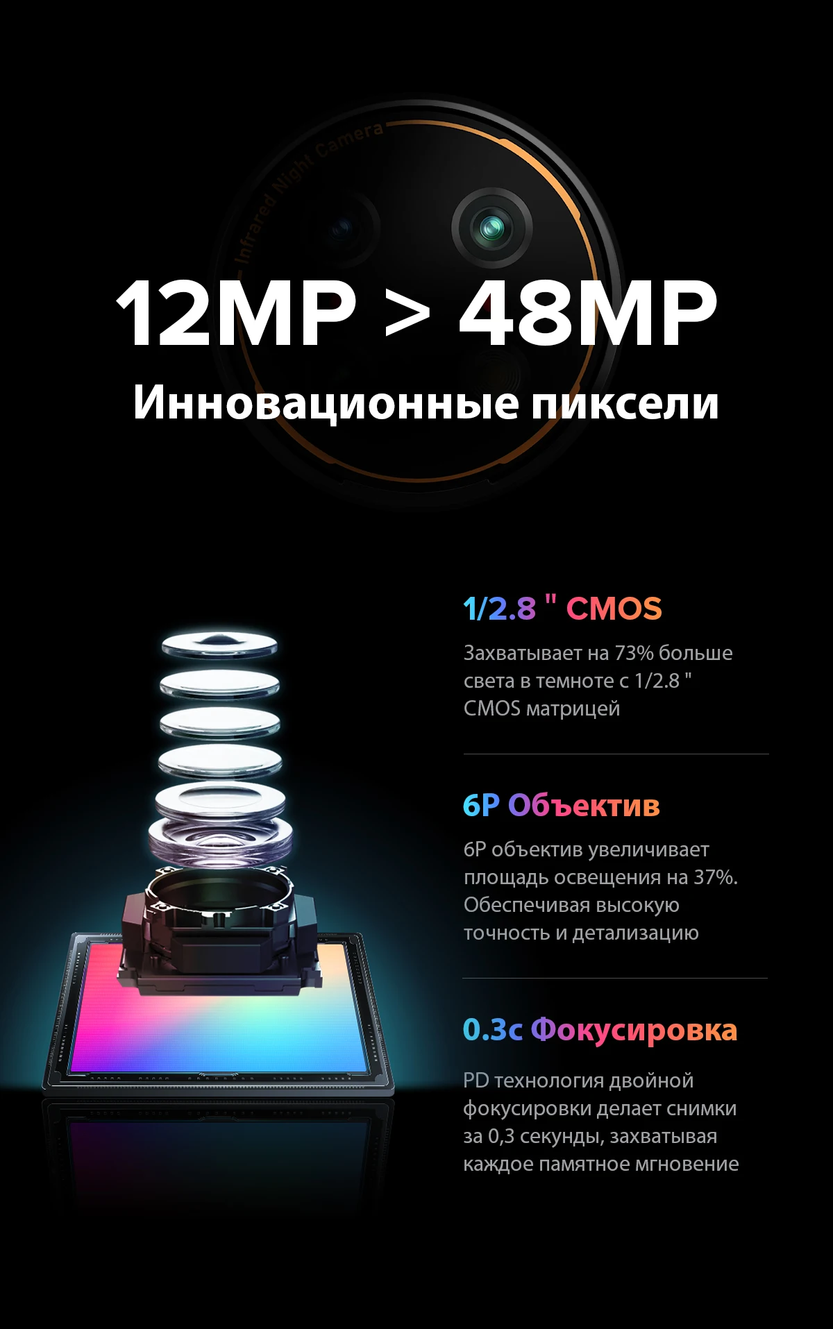 12MP камерою на задній стороні корпусу (реальні Ефекти> 48MP), 1,28 мм CMOS, об'єктив 6P, 0,3 s подвійний фазовий